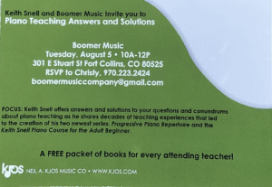FCMTA members, you and any guests are invited to a workshop by Keith Snell on August 5th 10am-12pm at Trinity Lutheran Church301 East Stuart Street in Fort Collins. Please RSVP to Christy at Boomer Music (970-223-2424 or boomermusiccompany@gmail.com) to receive your free packet of books and workshop materials.  Non members and members of other associations and teaching affiliations are very welcome.  Please feel free to bring guests.